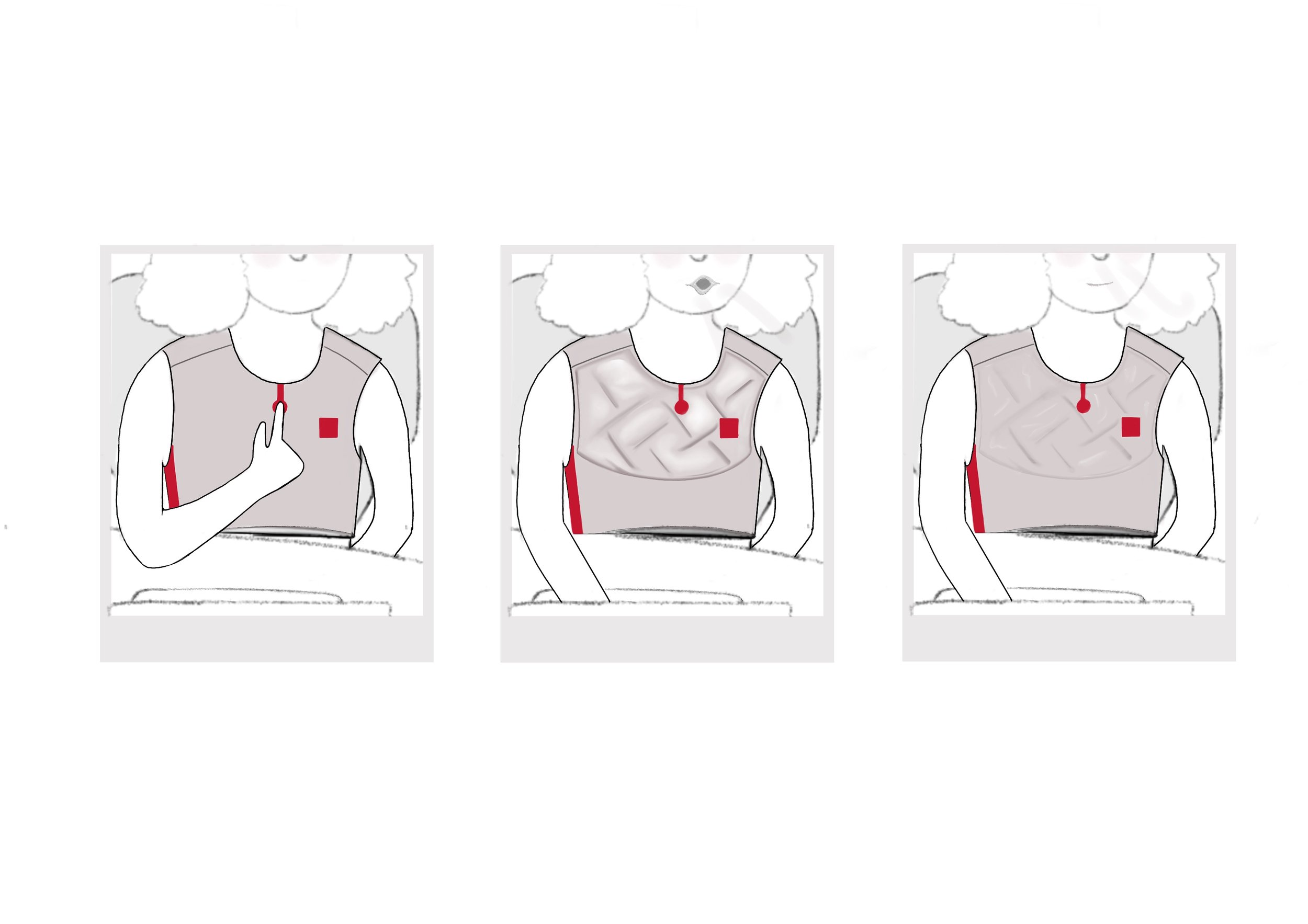 Before anxiety rises, it rests as a quiet form, soft, wearable, and harmoniously integrated into daily life. But when the body begins to spiral into shallow, chaotic breathing, Schwa is activated. There’s no need for focus or instruction, only presence. Through subtle inflation and deflation across the chest, it mirrors the rhythm of calm breath. The body, naturally responsive to physical cues, begins to entrain itself to this rhythm.
